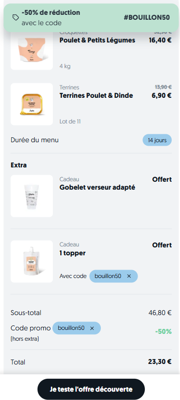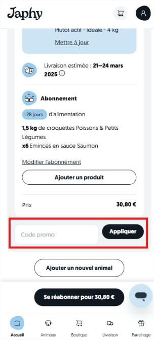 Les codes promo doivent être saisis au moment de l’inscription pour être appliqués sur la première commande. Malheureusement, nous ne pouvons pas les ajouter après le paiement.