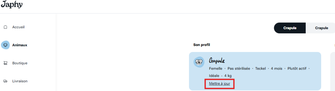 Nous vous invitons par conséquent à mettre à jour le profil de votre animal depuis votre Espace Membre onglet "Animaux" puis "Mettre à jour".