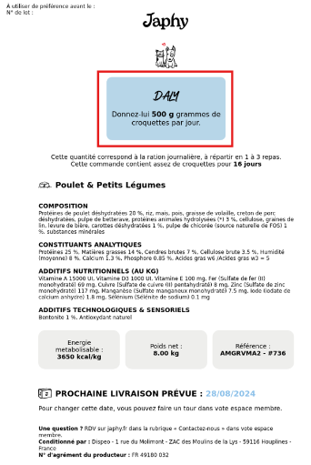 Les rations que vous devez donner à votre animal se trouvent sur la « Fiche Menu » envoyée avec les croquettes.