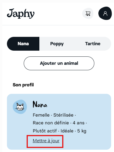Sachez que la recette de votre compagnon ne se met pas à jour automatiquement donc pensez bien à mettre à jour régulièrement son profil pour qu'on puisse continuer à lui proposer la recette la plus adaptée à ses besoins.